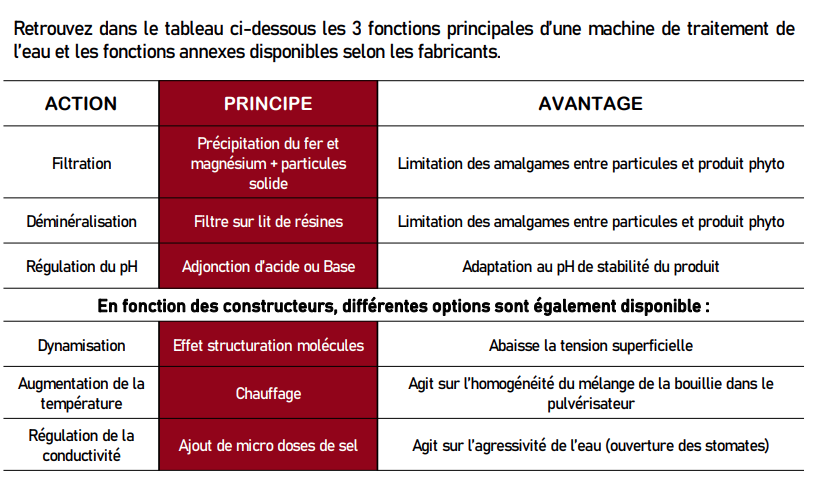 Ce que disent les études sur l’intérêt : les technologies de traitement (charbon actif, échange d’ions, osmose inverse) réduisent la charge en éléments indésirables (matières organiques réactives, ions, résidus) et peuvent rendre l’eau plus « neutre » pour la préparation des bouillies. Des études récentes comparent l’efficacité des technologies pour l’élimination des pesticides/dérivés et des composés interférents.